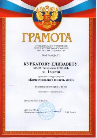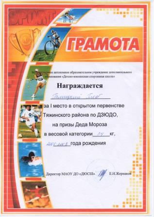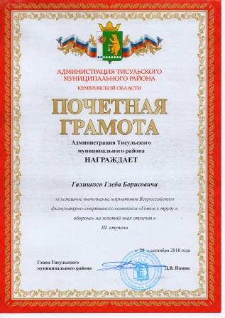 -за успешное выполнение Всероссийского физкультурно-спортивного комплекса «Готов к труду и обороне» на золотой знак отличия в 3 ступени и 1 место в открытом первенстве Тяжинского района по ДЗЮДО – Галицкий Глеб.